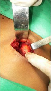 The patient was surgically intervened two months after the initial evaluation at consultation. The surgical approach was made with a transverse lumpectomy incision over the tumour, where a small ring of 1cm x 1cm containing the herniated tumour was found, composed of preperitoneal fat, no sac was described (Figure 3).