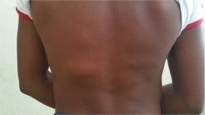 A 14-year-old african-american male patient, belonging to the urban area, presented to the paediatric hospital with no previous history of diseases. He noticed a swelling, occasionally painful, located in the left side of the lumbar region. This swelling increased on active movements and disappeared on prone position (Image 1). The patient’s mother refers to have noticed this swelling 7 years ago and two years before the consultation it was diagnosed as a lipoma by his family doctor.